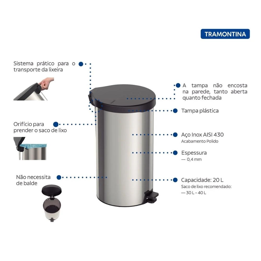 Ter a Lixeira Tramontina em casa significa ter um item funcional, elegante e resistente, que contribuirá para manter seu espaço limpo e organizado de forma prática e eficiente.