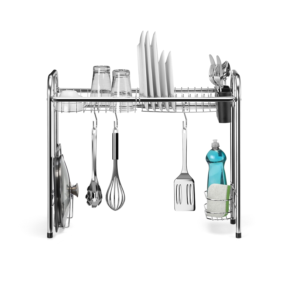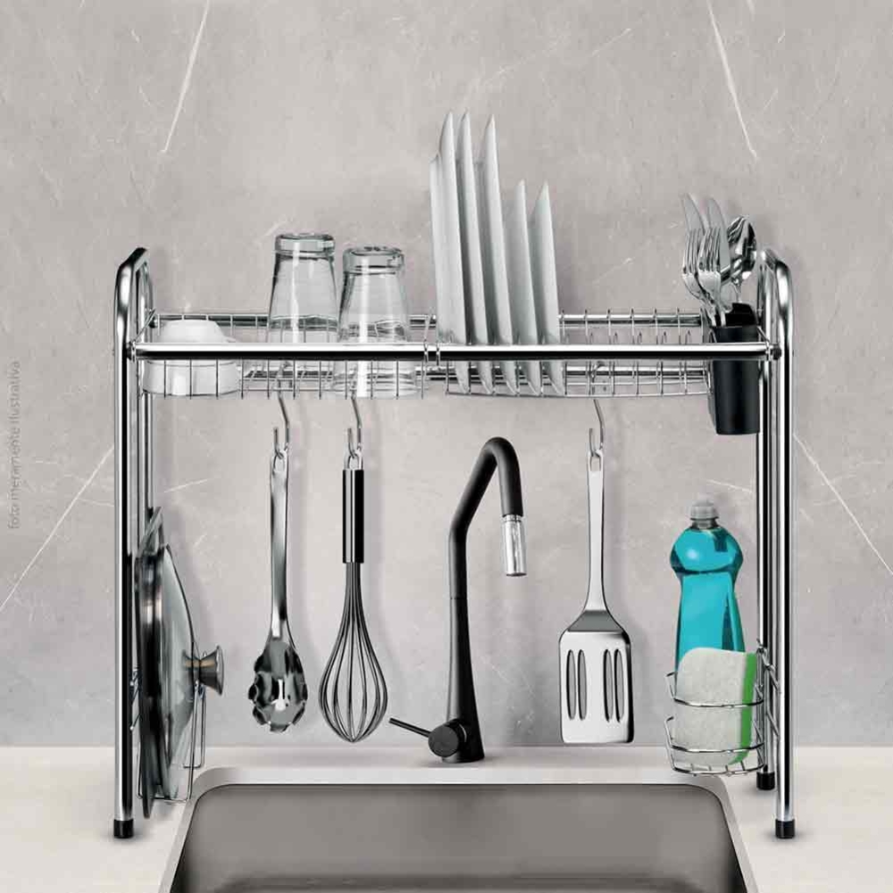 Este inovador acessório combina funcionalidade e elegância, projetado para se encaixar perfeitamente sobre a pia, liberando espaço valioso sem a necessidade de ocupar os espaços laterais. Sua estrutura cromada não só adiciona um toque de modernidade à sua cozinha, mas também oferece durabilidade e resistência.