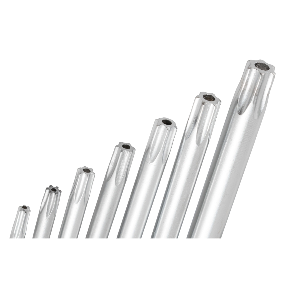 O Kit de Chaves Torx com 10 peças é a escolha ideal para simplificar suas tarefas diárias. Com medidas variando de T9 a T50 (Medidas: T9 , T10, T15, T20, T25, T27, T30, T40, T45 e T50), este conjunto é perfeito para apertar ou soltar parafusos Torx em uma variedade de situações. As chaves apresentam um design prático, com um furo no meio para uso especificos. Seja para consertos em casa, projetos de bricolagem ou manutenção de veículos, estas chaves Torx oferecem a versatilidade necessária para enfrentar diversos desafios. Torne suas tarefas cotidianas mais fáceis com este kit funcional e confiável.
