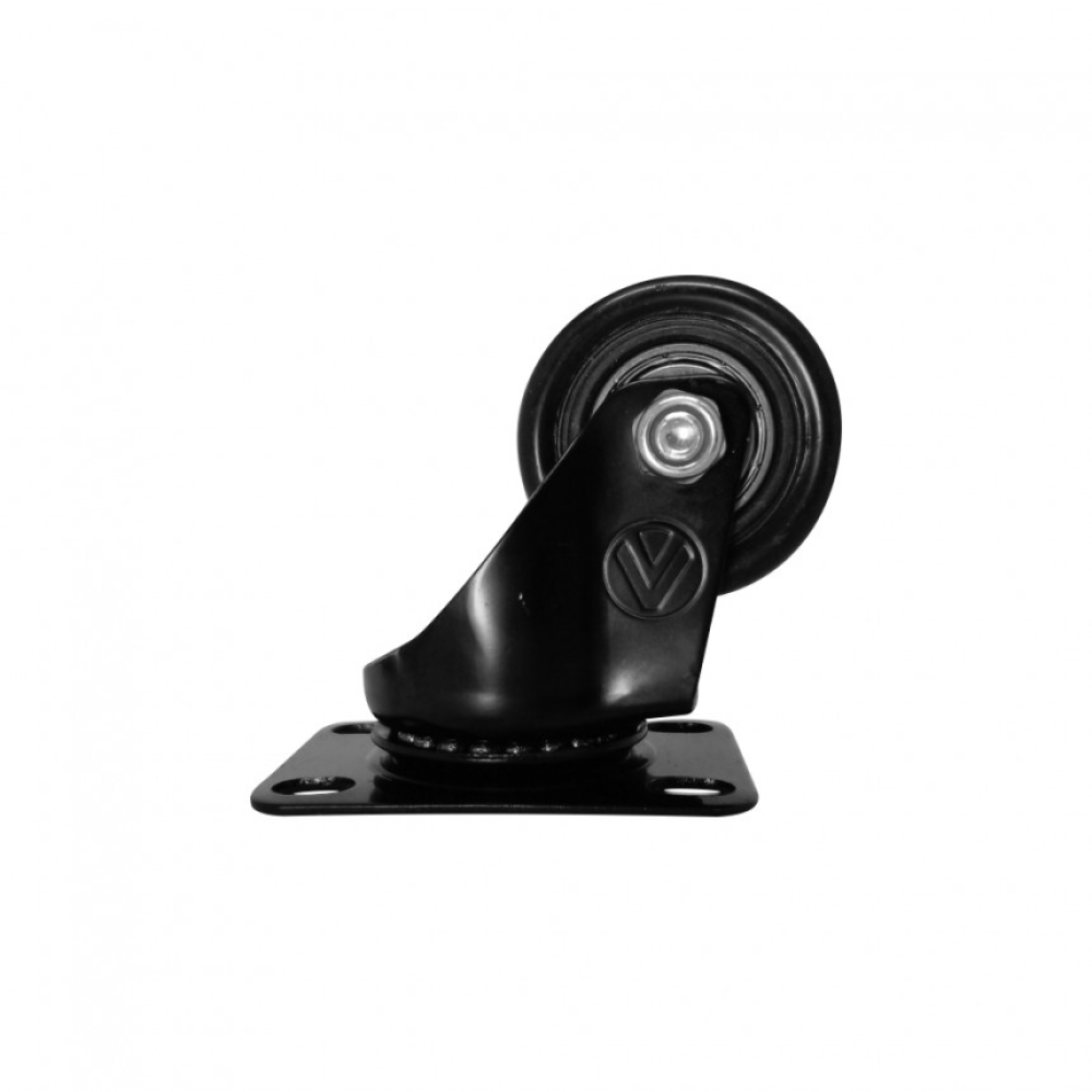 Rodízio com rolamento duplo de esferas. Garfo em aço com pintura em epóxi, roda em termoplástico e PVC preto com núcleo de polipropileno preto.