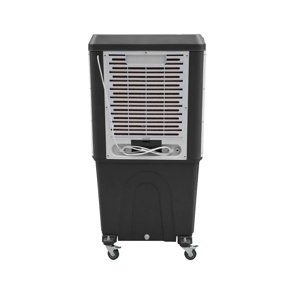 Possui um reservatório de 100 litros, podendo ser abastecido manualmente ou conectado diretamente à rede hidráulica para reabastecimento contínuo. Seu sistema evaporativo tipo colmeia resfria e umidifica o ar com eficiência, enquanto suas aletas oscilantes garantem uma melhor distribuição da ventilação. Conta com controle de ventilação com três níveis de velocidade e um sistema de proteção para a bomba, que desliga automaticamente caso falte água no reservatório.