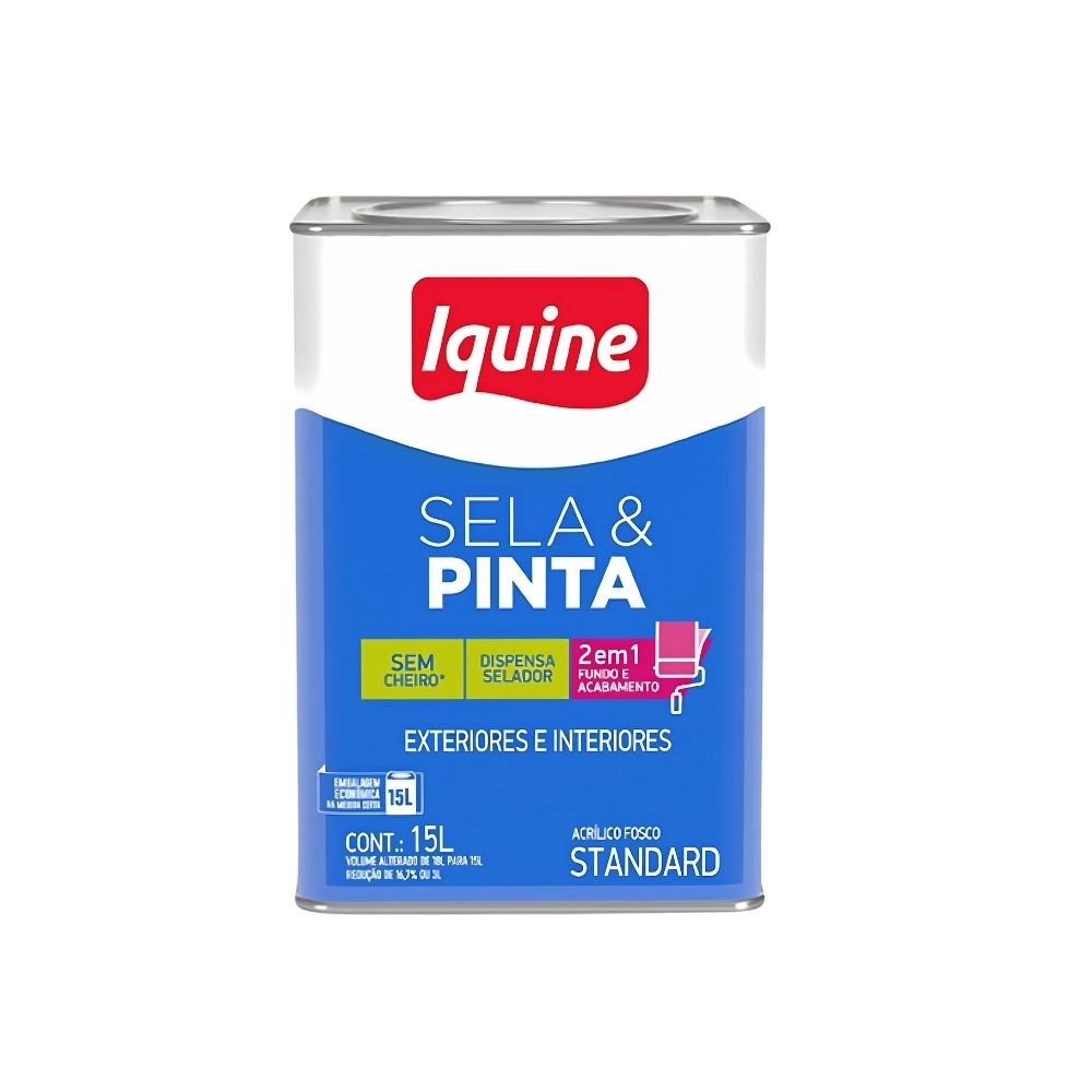 A Sela & Pinta Branco Neve 15 L da Iquine é uma tinta prática que une fundo e acabamento em um só produto, ideal para quem busca agilidade e economia na pintura. Indispensável para reformas, é indicada para uso interno e externo em superfícies de alvenaria, concreto, reboco ou fibrocimento, dispensando o uso de selador prévio.