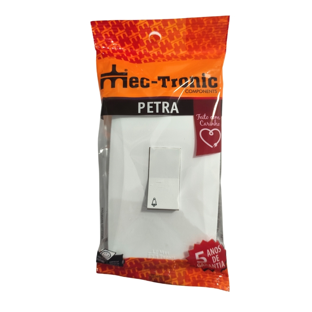 1 Pulsador Campainha 10A/250V~ Engate Rápido com placa Vertical Petra - Linha Petra. Elegante, robusta e moderna. Mais uma obra de arte com o selo Mec-Tronic®. Design porfioso, permite o acabamento perfeito com a parede da sua casa.