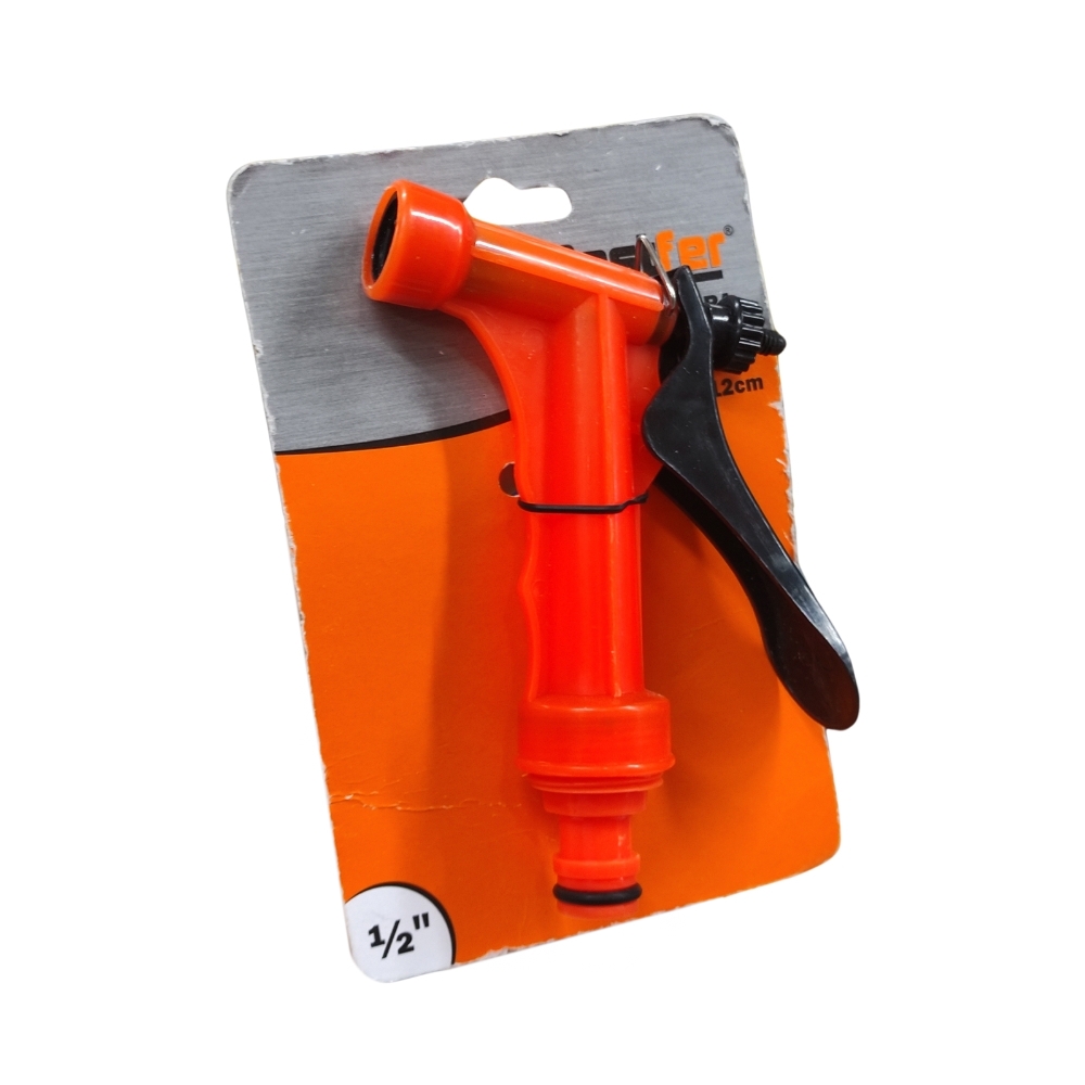 Esguicho em forma de pistola, com gatilho para acionar a vazão de água e é compatível com adaptadores engate rápido, sendo utilizada para manter a mangueira fechada sem necessidade de fechar o registro, controlar a saída de água e aumentar ou diminuir o fluxo do jato de água.
